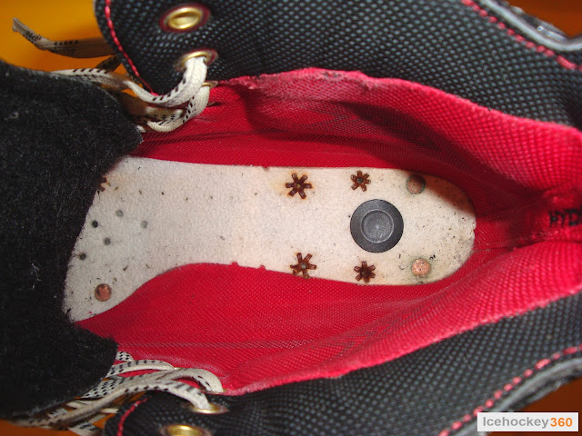 Несколько слов хочется сказать про стельку. Для большего комфорта имеется подушка из пены в виде красного овала. Задняя часть стельки имеет бортик с покрытием «грип». Немного «гриповки» присутствует и в области пальцев. Все это вместе с очень плотной посадкой стельки в ботинке конька благоприятно сказывается на передаче энергии от ноги к коньку и дает выигрыш при разгоне. В середине имеются отверстия для отвода влаги в подкладку под стелькой.