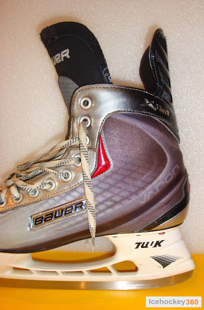 Особенно мне нравится как выглядит задняя часть коньков, и в плане дизайна, и в плане конструкции. Задний язычок очень жесткий и твердый, обеспечивает высокий уровень защиты. Изготовлен он с применением сетки из синтетической нити . При этом он наклонен вперед, а место, где располагается пятка, немного выпирает из ботинка. Такая геометрия ботинка заставляет держать ноги в немного согнутом состоянии и позволяет ногам игрока быть все время в том положении, когда они могут мгновенно перенести усилие с ног на коньки и оттолкнуться. Не случайно производитель позиционирует эти коньки для игроков, которым нужны быстрые ускорения и максимальная маневренность. Кому-то может показаться, что этот наклон заднего язычка всего лишь очередной маркетинговый ход, но от себя могу сказать, что со временем, когда я попробовал другие коньки, мне очень не хватало в них именно этой фишки.