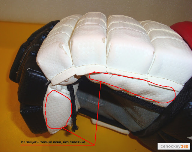 Наполнение в этих крагах — «Trilam». В итоге имеем очень мягкие перчатки, в защите которых используется обычная пена, обеспечивающая достаточно посредственную защиту. Пластик в них используется только для защиты большого пальца (защита от вывиха отсутствует) и верхней части манжеты по кругу (та часть, что покрыта белой искусственной кожей). Защита откровенно слабая, и будет чуть лучше, чем в Bauer Vapor X20 или X30 (хотя в них пластик вообще только в большом пальце). Пробный удар клюшкой по крагам Warrior оказался болезненным. В качестве соперника использовал вышеупомянутые Vapor Х20 и ССМ U+CL. Перчатки от ССМ выиграли со значительным преимуществом, удар по ним вызвал почти не ощутимые болезненные ощущения. На второе место я бы поставил Frinchice. И замыкает тройку Vapor X20.