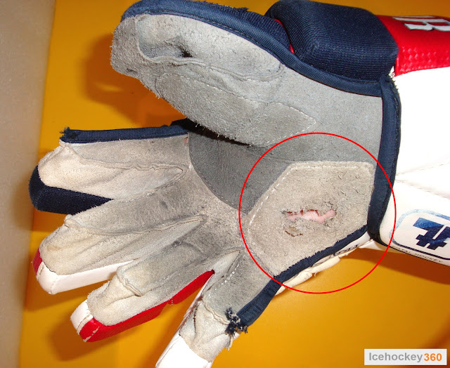 Износ материала отделки со стороны указательного пальца традиционно высок. На правой перчатке он выше, поскольку Евгений играет под правую руку, а нижняя рука всегда собирает множество следов от ударов.