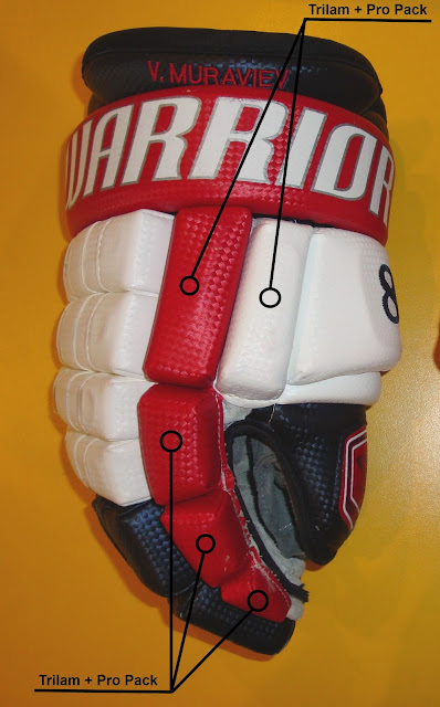 — Удалось примерить классические Warrior Franchise 14 размера — показались слишком широкими, но в длину сели отлично. Поэтому выбрал именно 14 размер, но зауженную модель («Narrow»), т.к. нравится чувство, когда перчатка сидит плотно и не стесняет движений. Однако, стоит отметить, что по сравнению с Vapor XXV 14 размера Warrior того же размера чуть больше. По поводу цветового решения, я взял за основу цвета своей команды, ЛХК «Орион», — черный, серый и сиреневый, но с учетом своих предпочтений в плане сочетания этих цветов основным решил сделать именно сиреневый. В плане защиты я не стал себя ограничивать и заказал все по-максимуму, поскольку защита рук для меня очень важна. Если опять же сравнивать по защите с Vapor XXV, то при ударе клюшкой разницы особо не заметил, в обоих случаях терпимо. При ударе шайбой уже дает о себе знать более высокая степень защиты в Warrior, в этой дисциплине они лучше. Также хочется отметить отличную манжету в Warrior. Отделку выбрал «карбоном», т.к. хотелось «хай-тека». Интересно наблюдать в перчатках плетение, сделанное наподобие того, что делают в клюшках. Ладошки выбрал из кожи кенгуру, поскольку их итак много в Австралии и люди часто жалуются на их засилье, особенно автомобилисты!:-))