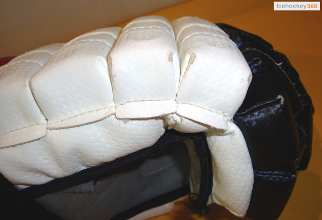 На большом пальце сделана вышивка игрового номера владельца краг. Отмечу также, что в большом пальце стоит замок, защищающий палец от вывиха. На фото видно, как протирается внешняя обшивка по контуру пластиковой вставки. Это очевидный минус «Pro Pack». Поэтому при покупке Вам придется сделать выбор между более высоким уровнем защиты и долговечностью внешней отделки.