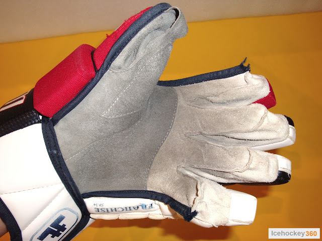 Ладошка в перчатках выполнена из «MicroNash», что является стандартным исполнением. В области пальцев «нэш» в один слой, ладонь сделана в два слоя (между швами), большой палец сделан в один слой, но усилен нашивкой, т.е. в этом месте покрытие также двухслойное. Ладошка мягкая, хорошо повторяет движения ладони, чувство клюшки отличное. Качество «нэша» очень высокое. За 17 месяцев использования по 3-4 тренировки в неделю ладошки на левой краге (нижней) выглядят очень достойно, нет и намека на протирание.