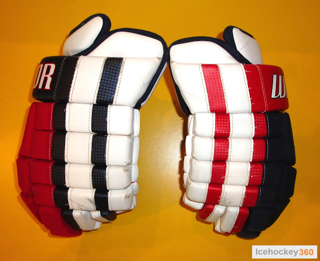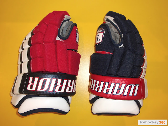 Виктор владелец краг Warrior Franchise со стажем. Мне на обзор он предоставил две пары. Первыми взглянем на более старые перчатки. Это специальная серия для американского магазина Totalhockey, которая называется «Home and Аway». В Америке цена на эти краги на момент покупки составляла 190$. Сейчас их можно приобрести за 150$. Особенность этой серии заключается в несимметричном цветовом решении. В данном случае перчатки выполнены в бело-сине-красных цветах (патриотично). Далее я буду использовать названия материалов (то, как их называет Warrior), подробное описание которых Вы можете посмотреть в первом обзоре краг этого бренда или в «кастомайзере» Warrior.