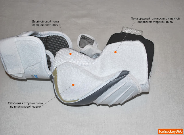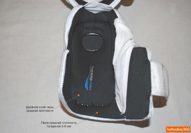 Сама защита бицепса двухсоставная. Задняя и внутренняя поверхности бицепса закрыты щитком, состоящим из пластиковой пластины, с наружной и внутренней стороны покрытой слоем пены средней плотности. Внутренний слой амортизатора при этом приблизительно в два раза толще. С внутренней стороны находится большая по площади оборотная сторона липы, поэтому затянуть ремень фиксации не составит труда.