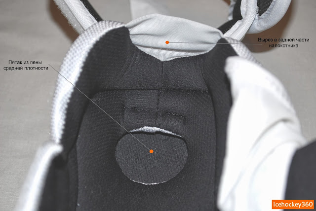 В качестве внутреннего амортизатора использован утолщенный слой пены средней плотности, в котором предусмотрена ямка для более надежной фиксации сустава. На дно углубления приклеен пятак из пены средней плотности, покрытый тем же ThermoMax. В задней части защиты предплечья расположен вырез с натянутым эластичным синтетическим материалом. Это должно способствовать большему комфорту благодаря тому, что толстая стенка пены не будет давить на руку при разгибании.