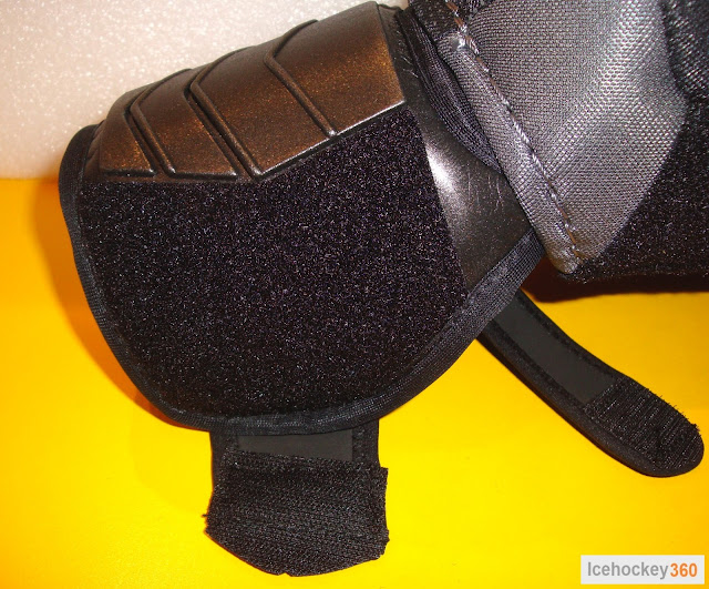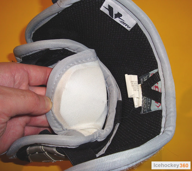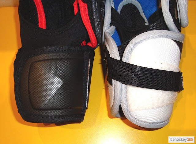 И осталось рассказать про защиту внутренней стороны предплечья. Она выполнена из пены «U Foam», но с твердым наружным слоем. Такой материал мы могли видеть, например, в трусах CCM U+CL в защите поясницы. На фото ниже заметно, что уменьшились размеры щитка. Понятно, что сделано с целью уменьшить вес налокотника, но все-таки я бы не стал экономить граммы на этой позиции, поскольку лично мне сюда приходится большое количество ударов и хочется быть максимально защищенным в этой области.
