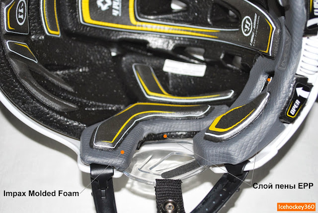 К недостаткам шлема также можно отнести и его немалый вес. В размере L он составляет 659 гр. Для сравнения приведу несколько цифр с характеристиками веса конкурентов в том же размере. Reebok 11К — 537 гр, Bauer RE-AKT — 554 гр, Easton E700 — 378 гр. Но это сравнение не совсем корректно, поскольку у каждой из этих моделей своя размерная сетка и Warrior будет самым маленьким из них (что опять говорит не в его пользу). Так что это скорее справочные цифры, чем показатели превосходства одной модели над другой. Столь высокий вес можно объяснить довольно сложным механизмом подгонки шлема — получается, что за универсальность и удобство придется расплачиваться лишними граммами.