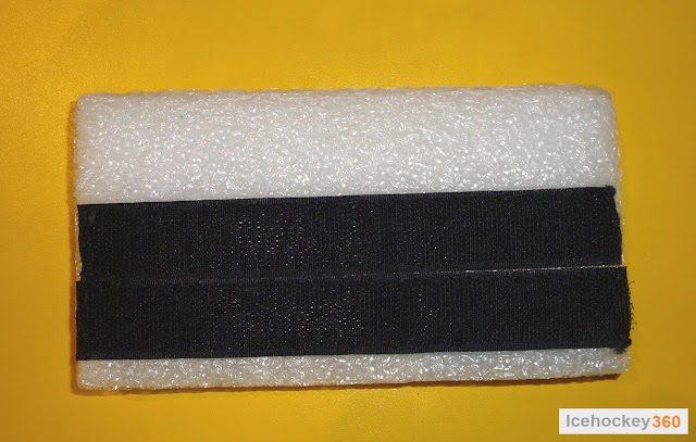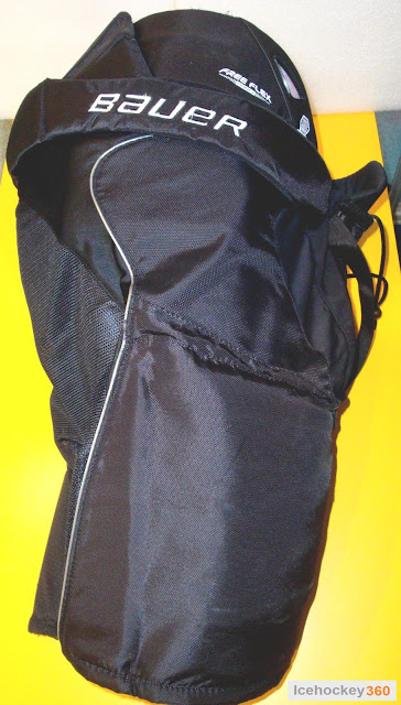 Переходим к поясу. Нижняя его часть разбита на 3 сегмента: 2 боковых с вышивкой названия производителя и 1 задний с указанием модели. В плане защиты, пояс выполнен из пены средней плотности и вместе с внутренним слоем пены они представляют собой неплохую защиту. Верхняя часть пояса разбита по периметру на 5 сегментов. Поскольку сейчас мы рассматриваем боковую, то логично рассмотреть боковой сегмент верхней части пояса. Он защищает печень, селезёнку и нижнюю часть рёбер. Выполнен он из композитного материала сотовой структуры, который Bauer называет «Vent Armor», который помещен в пластик. Для лучшей защиты на нём имется ребро жёсткости. Амортизатором служит пена средней плотности. Боковой сегмент имеет анатомическую форму, которая позволяет лучше облегать тело игрока.