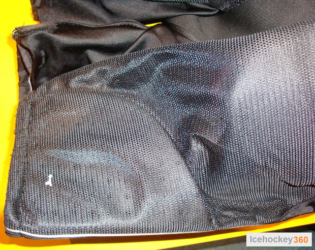 Между поясом и сеткой расположился ещё один вид материала. Это эластичный, тянущийся во все стороны материал, на ощупь гладкий. Он очень напоминает тот, что используется спереди для вентиляции в области паха, но на вид глянцевый и более гладкий по тактильным ощущениям. Он сразу мне показался слишком хлипким и не способным противостоять различным воздействиям. И действительно, после зацепа клюшкой он порвался.