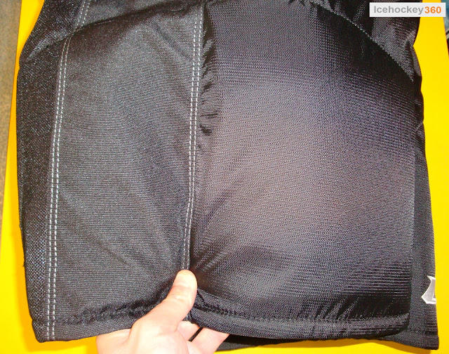 Защита бедра, как и прочие элементы (кроме копчика и небольших вставок в поясе) выполнена, как я уже говорил ранее, без применения пластиковых пластин. Вместо привычного для всех «пирога» защита представляет собой два слоя пены. Внутренний слой — это пена средней плотности толщиной 6 мм. Такую пену можно встретить в качестве амортизатора в большинстве моделей трусов под пластиковой пластиной. А ту самую пластиковую пластину заменяет пена U Foam, которая в данной области очень плотная, пальцами её прожать невозможно. Толщина этого слоя 10 мм. Наружная поверхность покрыта чёрным материалом, который мы увидим на защите спины. Этот материал придает поверхности твёрдость. Оба слоя пены склеены между собой. Щиток имеет 3 горизонтальных ребра жёсткости. В целом решение интересное, но стану утверждать насколько хорошо оно будет работать, всё это покажет эксплуатация. Поскольку вынуть щиток в этих трусах возможности нет, я сделал фото через стык внутренней обшивки.